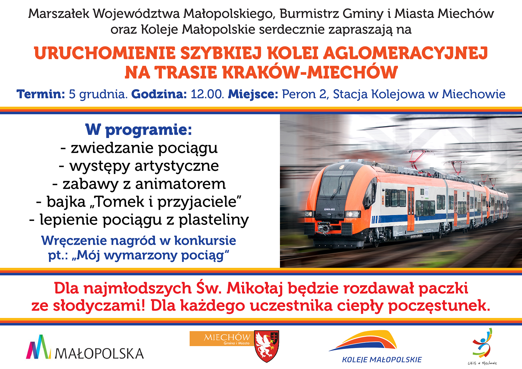 Marszałek Województwa Małopolskiego, Burmistrz Gminy i Miasta Miechów oraz Koleje Małopolskie serdecznie zapraszają na uruchomienie Szybkiej Kolei Aglomeracyjnej na trasie Kraków – Miechów.