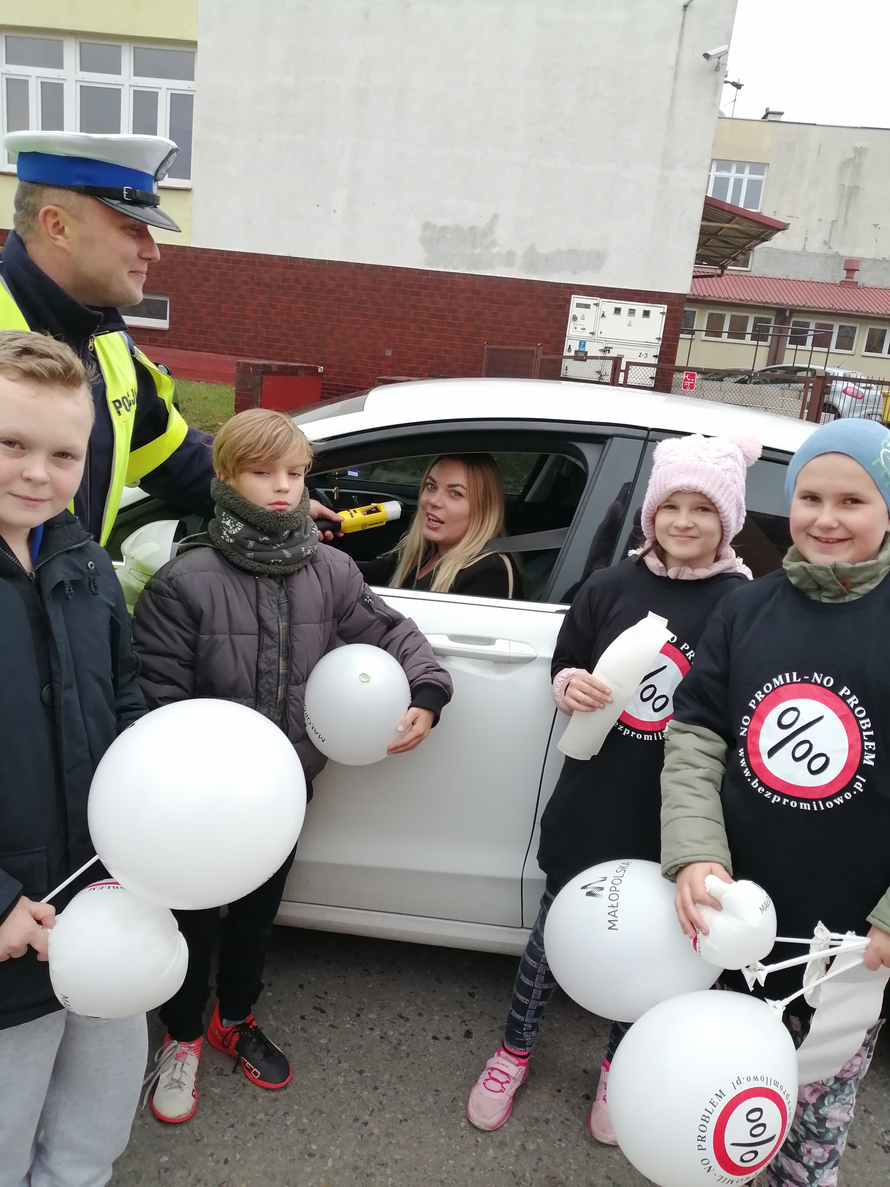 Kontrola odbywała się w godzinach 12.00-13.00, w tym bowiem czasie największa liczba rodziców i opiekunów przyjeżdża po swoje dzieci do szkoły. Funkcjonariusze policji: starszy sierżant Lidia Kyzioł i sierżant sztabowy Adrian Bochenek przeprowadzili badanie alkomatem około 50 kierowców. Wspierali ich uczniowie klasy IVb: Karolina Wlazło, Patrycja Grzybczak, Mateusz Bijak, Kacper Bułka i Wiktor Bujak.
