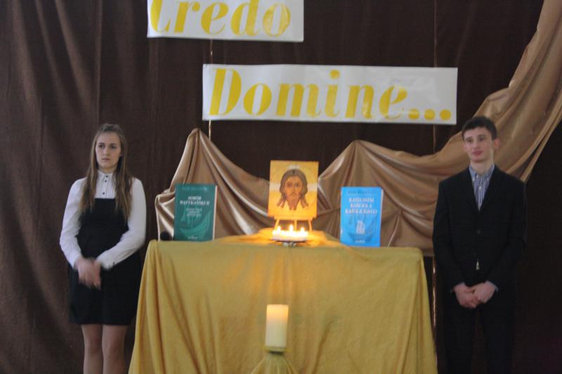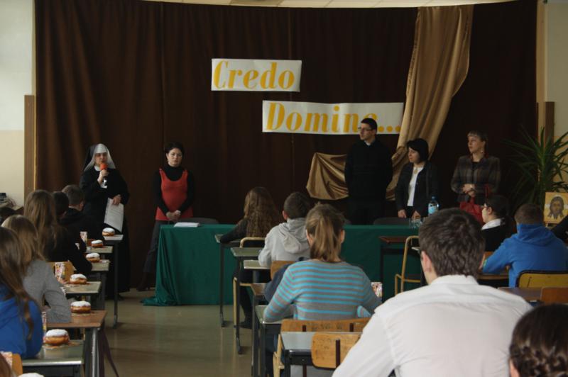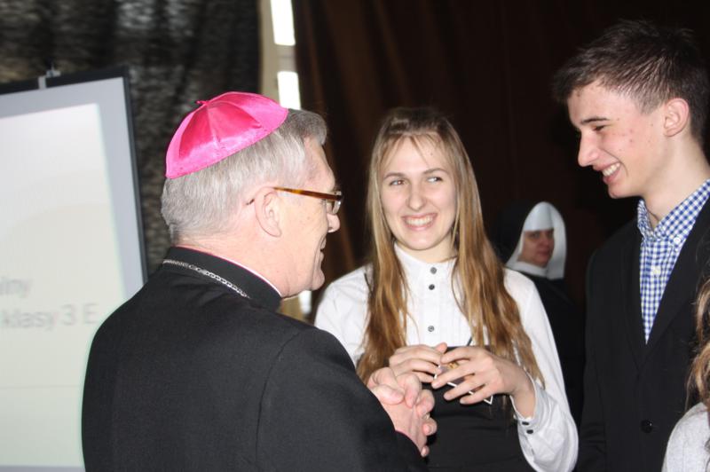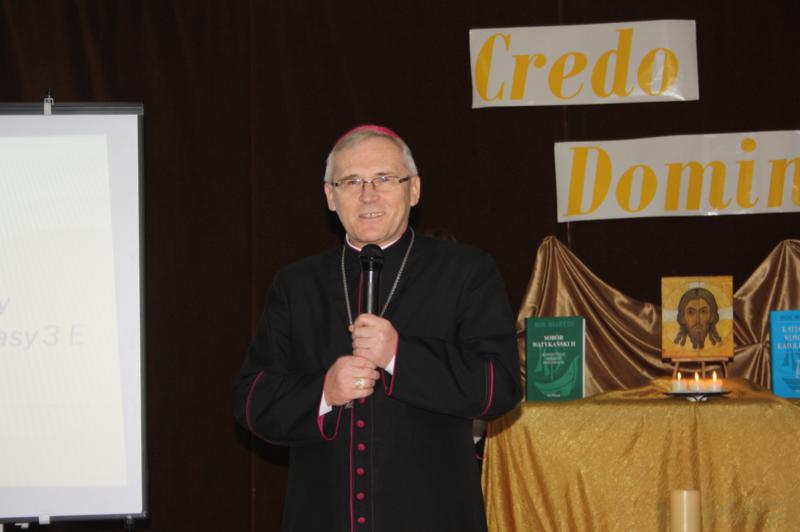 Dzięki wierze „ na granicy śmierci nie ma śmierci… jest życie”. Uzupełnieniem występu była prezentacja multimedialna przygotowana przez uczniów klasy III e o obchodzonym Roku Wiary. Motywem przewodnim prezentacji była pieśń – tekst Psalmu XVIII w wykonaniu Piotra Rubika. Ksiądz biskup Kazimierz Gurda, podczas rozważań , zwrócił się do młodzieży, podkreślając rolę słowa „wierzę”. - To słowo „wierzę” sprawia, że rozpoczyna się od wtedy relacja przyjaźni między człowiekiem a Bogiem. W tym słowie zawarte jest także zaufanie człowieka do Boga, czyli prośba o opiekę. To słowo „wierzę” należy powtarzać nie tylko w sercu, ale także najbliższym. Z wiary wypływa filozofia życia, prawda, która pochodzi od Boga – twierdził biskup Kazimierz Gurda. Ksiądz biskup podczas spotkania z nauczycielami zwrócił uwagę na konieczność oparcia wychowania młodych ludzi na wartościach chrześcijańskich, mówił także o zagrożeniu współczesnego świata oraz o wpisaniu praw boskich w wartość człowieka.