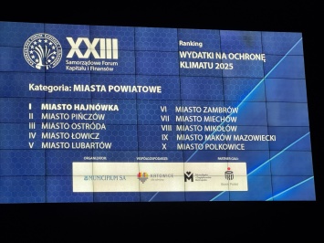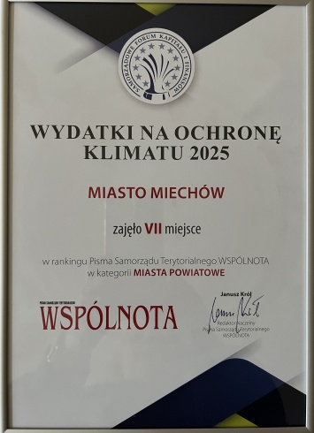 Miechów został laureatem Rankingu Wydatków na Ochronę Klimatu 2025, zajmując 7. miejsce w kraju (w kategorii - miasta powiatowe), a jednocześnie 1. miejsce w Małopolsce.