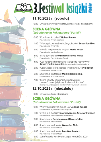 Od 10 do 12 października 2025 roku Miechów ponownie zamieni się w tętniące życiem centrum spotkań z literaturą, muzyką i kulturą. Trzecia edycja Festiwalu Książki to trzy dni pełne rozmów, warsztatów i wydarzeń, które na stałe wpisały się już w kulturalny kalendarz naszego miasta.