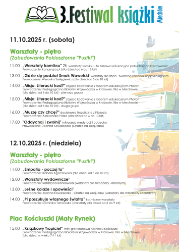 Dla najmłodszych przygotowano warsztaty rozwijające empatię, kreatywność i wyobraźnię, a także leśne opowieści i kosmiczną podróż z bohaterem Pi. Dorośli odkryją kulisy powstawania książki podczas warsztatów wydawniczych, a na Placu Kościuszki czekać będzie rodzinna gra terenowa „Książkowy Tropiciel”.