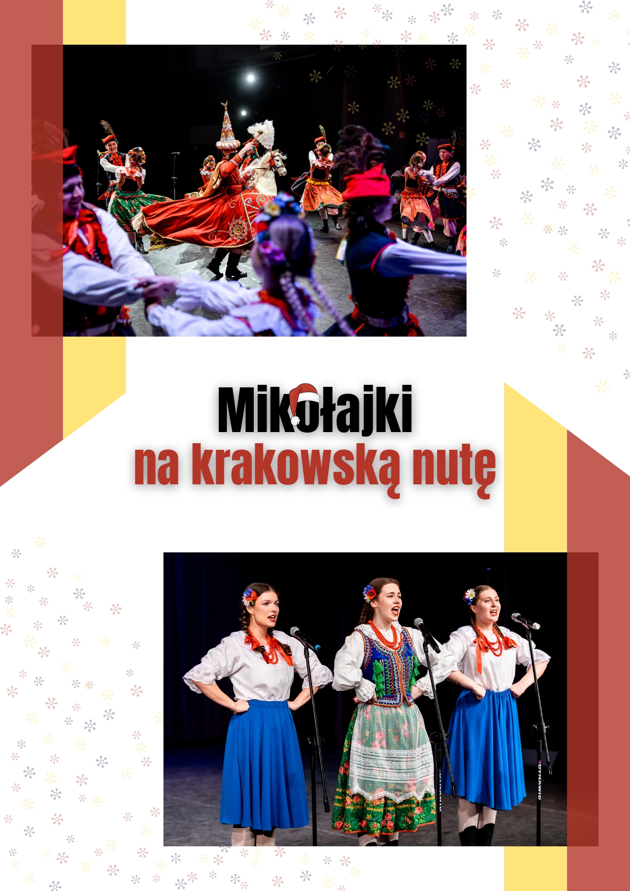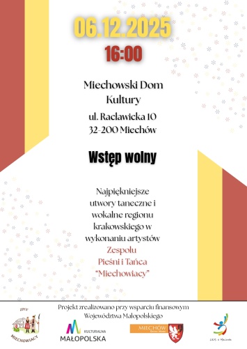 O godzinie 16:00 zapraszamy na mikołajkowy koncert w wykonaniu Zespołu Pieśni i Tańca „Miechowiacy”, który wprowadzi wszystkich w magiczny, zimowy nastrój.