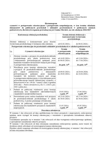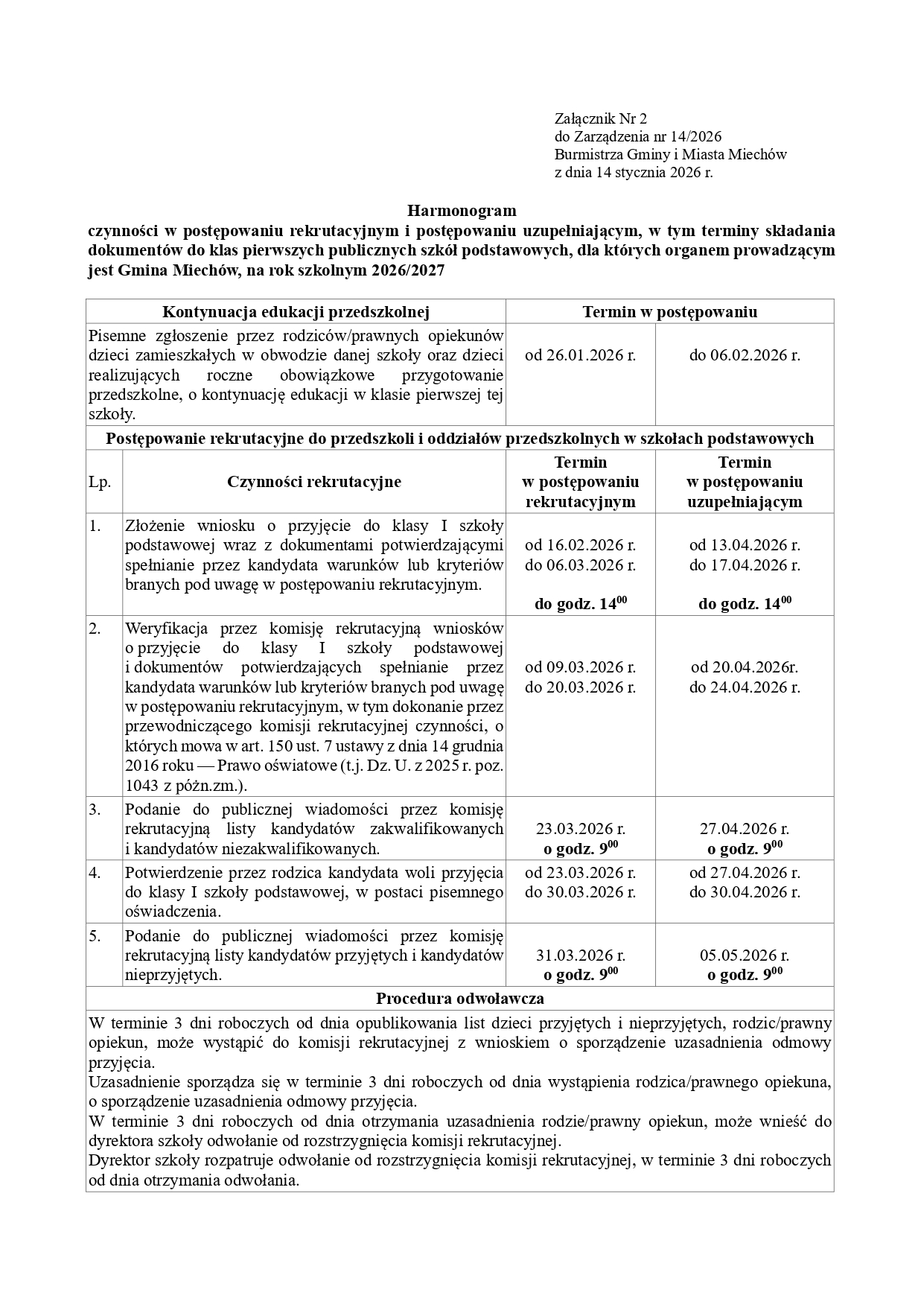 W związku z Zarządzeniem nr 14/2026 Burmistrza Gminy i Miasta Miechów z dnia 14 stycznia 2026 roku, poniżej podajemy harmonogram przeprowadzania postępowania rekrutacyjnego i postępowania uzupełniającego, w tym terminy składania dokumentów do publicznych przedszkoli i oddziałów przedszkolnych w publicznych szkołach podstawowych oraz klas pierwszych publicznych szkół podstawowych, prowadzonych przez Gminę Miechów na rok szkolny 2026/2027.