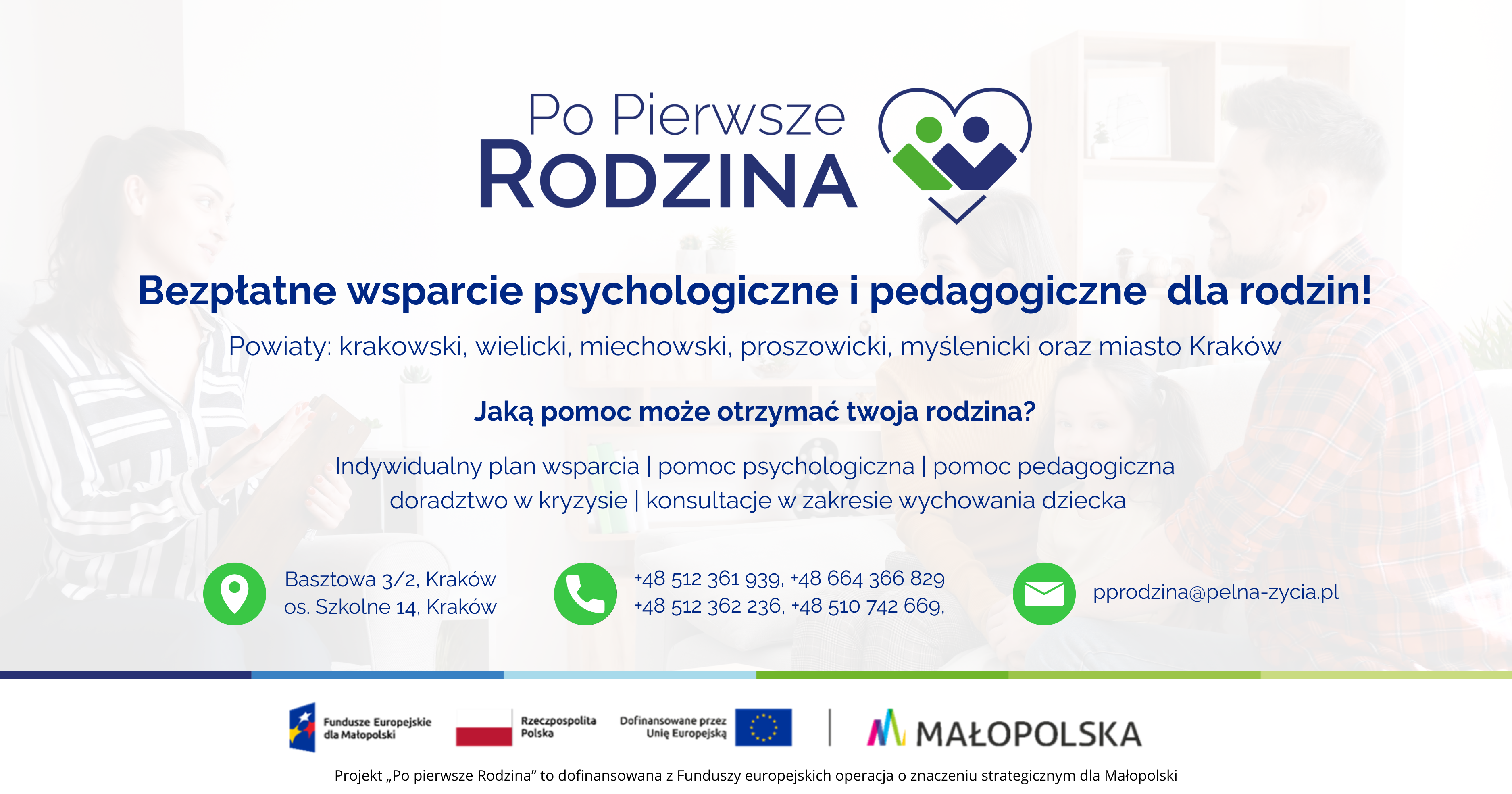 Projekt „Po Pierwsze Rodzina” oferuje bezpłatną pomoc psychologiczną i pedagogiczną dla rodzin zamieszkujących powiaty: krakowski, wielicki, miechowski, proszowicki, myślenicki oraz miasto Kraków.